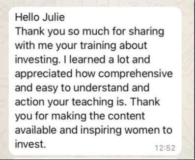 "Julie is a true wealth witch in the best way possible. I watched her webinar on opening a brokerage account and she broke it down so easily and made it digestible for everyone. I have already been investing and even with that she helped me understand so many concepts and tips at a deeper level. I highly recommend Julie as she is one to watch and learn from if you're a newbie or even advanced as she has a "wealth" of knowledge. Pun intended!!"